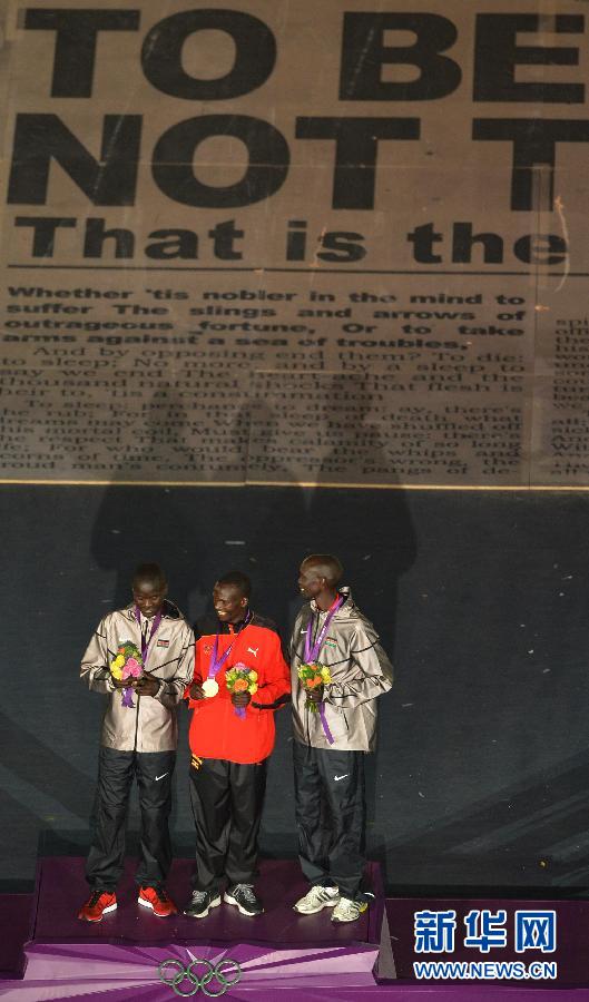 2012年8月12日,第三十屆夏季奧林匹克運動(dòng)會(huì )閉幕式在倫敦奧運會(huì )主體育場(chǎng)舉行。圖為閉幕式上舉行的男子馬拉松頒獎儀式。當日,在2012倫敦奧運會(huì )男子馬拉松比賽中,烏干達選手斯蒂芬·基普羅蒂奇(中)以2小時(shí)08分01秒的成績(jì)奪冠。 新華社記者 王慶欽 攝