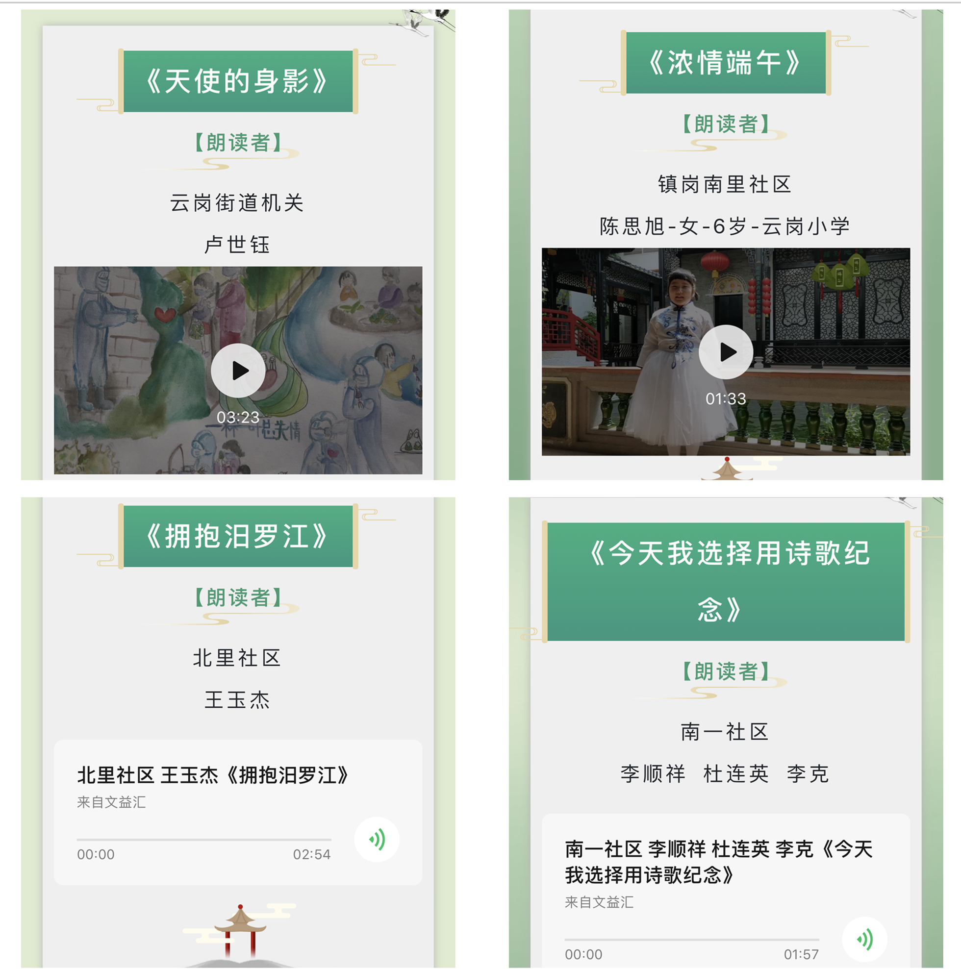 “往年端午節,都是在線(xiàn)下以各種形式舉辦活動(dòng),弘揚家國情懷、感受中華優(yōu)秀傳統文化、寄托美好愿望。疫情期間,為防止人流密集、保證居民身體健康,目前還不能開(kāi)展聚集性活動(dòng),通過(guò)‘互聯(lián)網(wǎng)+文化’的形式,讓轄區居民朋友們匯聚‘云端’,在感受傳統文化魅力的同時(shí),學(xué)習防疫知識,用聲音、用畫(huà)筆為抗疫加油鼓勁!”云崗街道辦事處社區建設辦公室副主任李明輝說(shuō)。