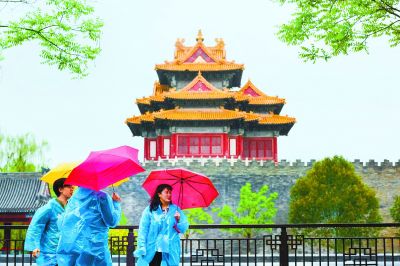 昨日京城春雨綿綿,故宮東北角樓旁,游客在雨中欣賞春色。本報記者 鄧偉攝