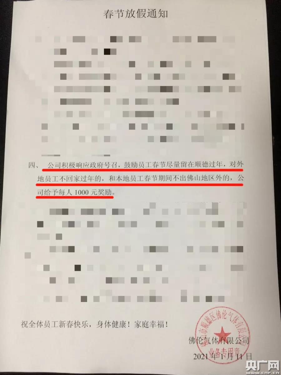 佛山順德一家企業(yè)推出暖心舉措,“真金白銀”獎勵留在本地過(guò)年的員工(央廣網(wǎng)發(fā) 受訪(fǎng)者供圖)