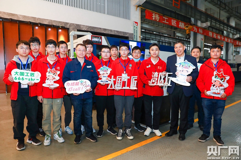 選手們手持激光打印出來(lái)的“大國工匠灣區行”,在生產(chǎn)線(xiàn)合影留念。(央廣網(wǎng)發(fā))