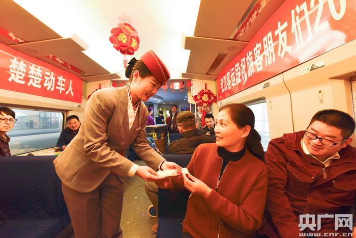 央廣網(wǎng)武漢12月31日消息(記者張毛清 黃炎秋 通訊員蘇杭 宋進(jìn)軍)“我希望今年我的孩子能考上理想的大學(xué)!”“我希望我可以找到一個(gè)女朋友!”“我希望我們的國家更加繁榮昌盛!”12月30日上午,在黃岡東開(kāi)往孝感東的C5342次列車(chē)上,武漢客運段舉行了慶元旦聯(lián)歡活動(dòng),動(dòng)姐與旅客共同寫(xiě)下新年愿望,相互祝福,迎接2018年的到來(lái)。