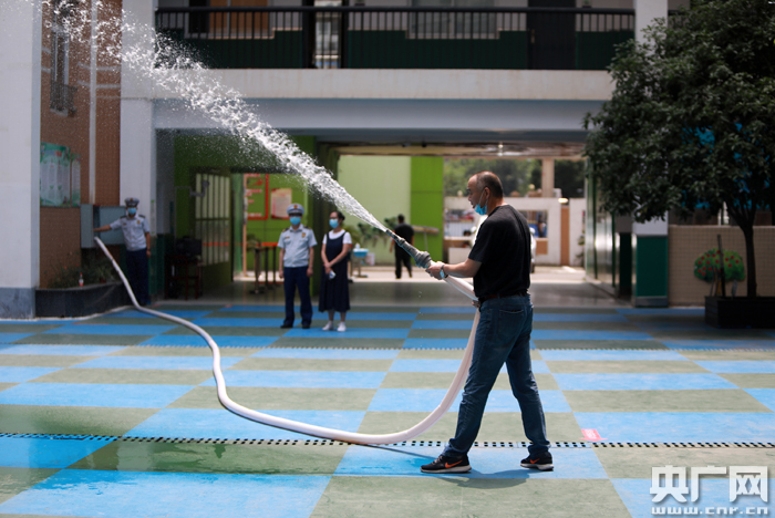圖為:2020年8月28日,在湖北省武漢市漢陽(yáng)區楚才小學(xué),一名工作人員正在演示利用校內消防設施快速滅火。(央廣網(wǎng)發(fā) 通訊員王方攝)