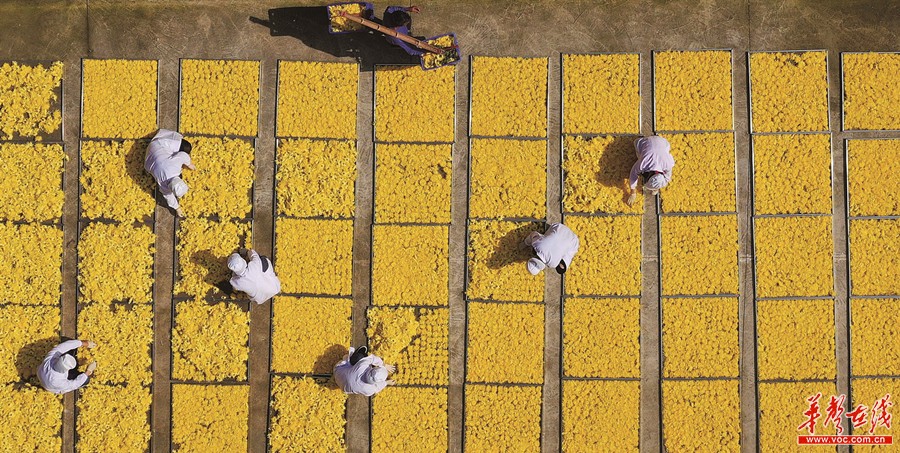 11月3日,衡陽(yáng)市南岳區壽岳鄉岳林村凰菊種植基地,菊農在晾曬菊花。金秋時(shí)節,該基地的600余畝高山凰菊進(jìn)入收獲采摘期,當地菊農搶抓晴好天氣進(jìn)行采摘、加工,確;司盏呢S產(chǎn)增收。