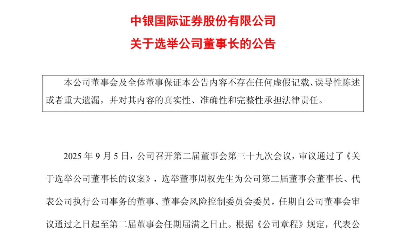 - 中銀證券近日發(fā)布董事長(cháng)變更公告,選舉周權為董事長(cháng)。