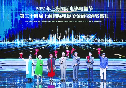 昨晚,第24屆上海國際電影節金爵獎頒獎盛典在滬舉行。電影表演藝術(shù)家走上舞臺,與觀(guān)眾分享他們與電影藝術(shù)的不解之緣,與年輕的電影人分享初心和堅守。左起:王曉棠、謝芳、祝希娟、梁波羅、達式常、童自榮、鄭大里。 迪雯 攝