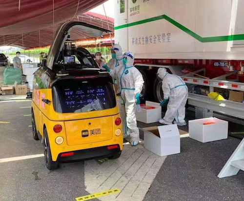 該車(chē)隊于6月5日凌晨出發(fā),連夜趕赴抗疫一線(xiàn)。首批車(chē)輛于6月6日傍晚正式進(jìn)入南沙區執行封閉管理的嘉安花園小區,為正在進(jìn)行隔離的約1800戶(hù)居民提供生活物資的配送服務(wù)。此外,無(wú)人車(chē)還配合美團買(mǎi)菜、美團優(yōu)選,開(kāi)展疫情風(fēng)險區生鮮果蔬的配送工作。