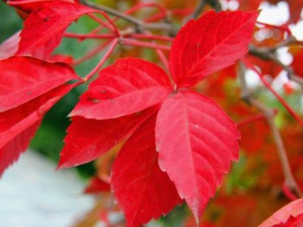 五葉地錦,又名美國地錦,葡萄科爬山虎屬。落葉大藤本,具分枝卷須,卷須頂端有吸盤(pán)。十月上旬葉色逐漸變紅,多用于園林墻壁及公路兩旁山巖裸露處綠化,也是優(yōu)良的觀(guān)紅葉樹(shù)種。